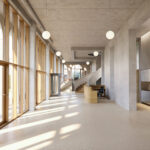 Bei der Wahl der Baumaterialien und der Hersteller wurde explizit darauf geachtet, das Gebäude möglichst nachhaltig umzusetzen. Die Betonfertigteile, die im nur 50 Kilometer entfernten Straßkirchen gefertigt wurden, haben nicht nur einen kurzen Transportweg zur Baustelle, sondern bestehen in sich auch aus regionalen Materialien. So ist zum Beispiel der Zuschlag aus nahe gelegenen Steinbrüchen gewonnen. Im Innenausbau wird ebenfalls viel Wert auf Nachhaltigkeit und nachwachsende Rohstoffe gelegt. Aus diesem Gund werden viele Oberflächen wie Türen, Trennwände oder Fenster aus Vollholz verbaut.
