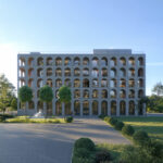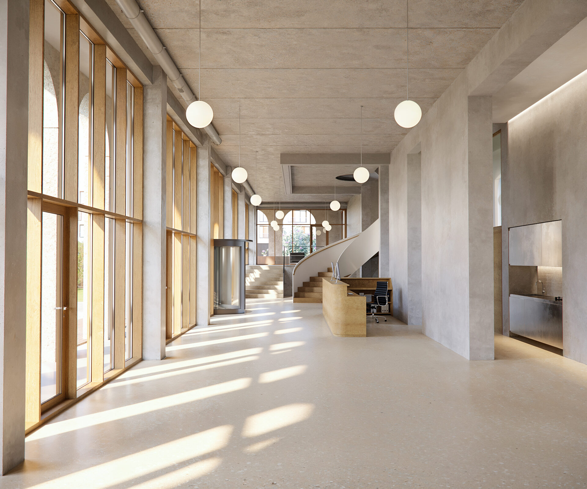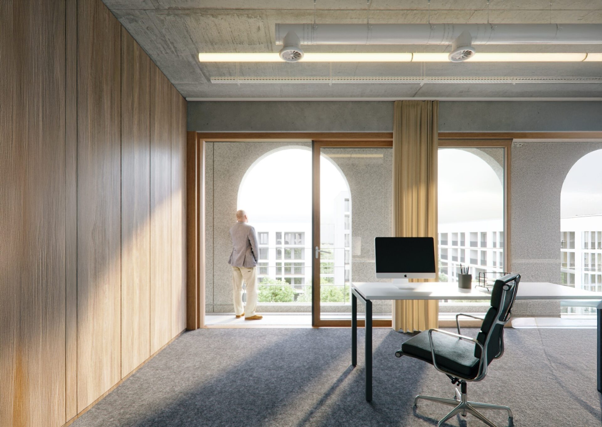 Auch in den oberen Etagen trägt die Bogenarchitektur zum Wohlbefinden der Mitarbeiter und Kunden bei. Hier entsteht eine durchlaufende Loggia, welche von den Büros aus betreten werden kann.