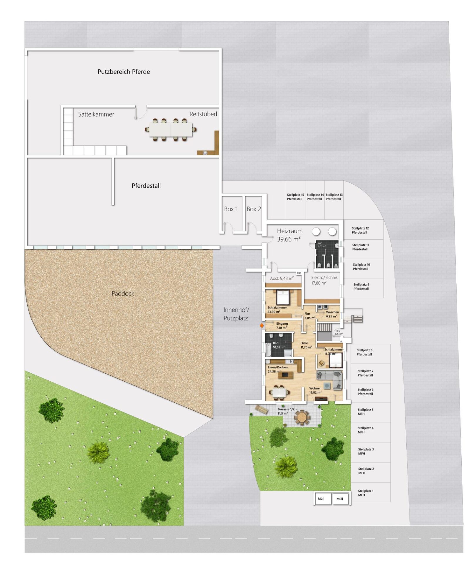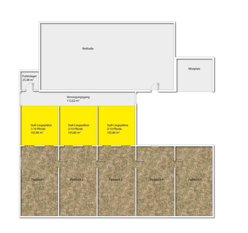Die Lage des Hofes ermöglicht eine schnelle Erreichbarkeit der wichtigsten Einrichtungen: kurze Wege zu Stall, Mistplatz, Reitplatz, Putzplatz und Halle sorgen für effiziente Arbeitsabläufe. Der Status der privilegierten Landwirtschaft erlaubt eine bauliche Erweiterung auf bis zu 60 Einstellplätze, was weiteres Wachstum ermöglicht.