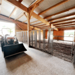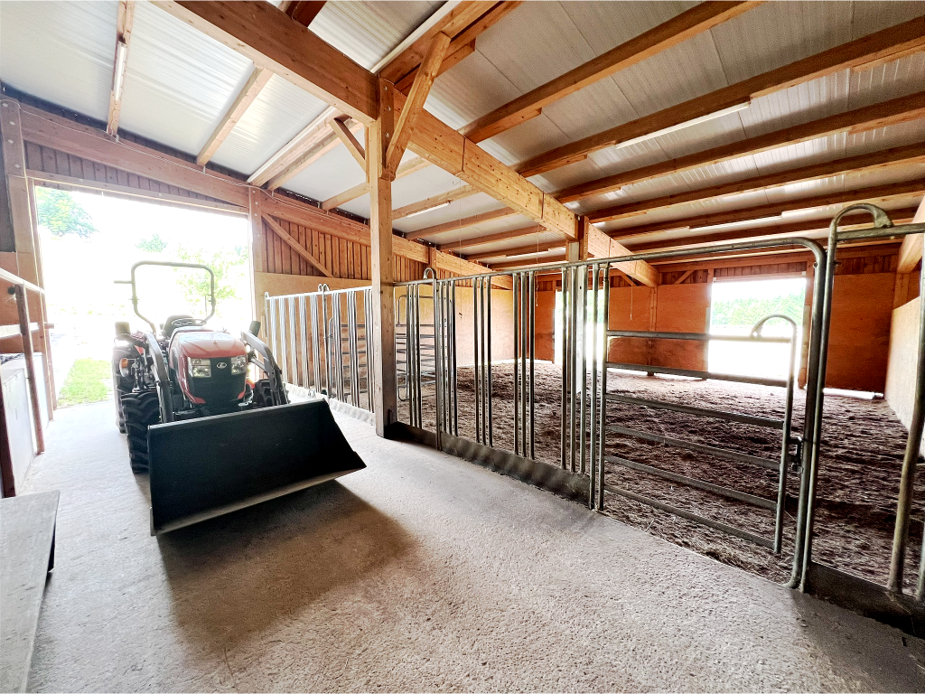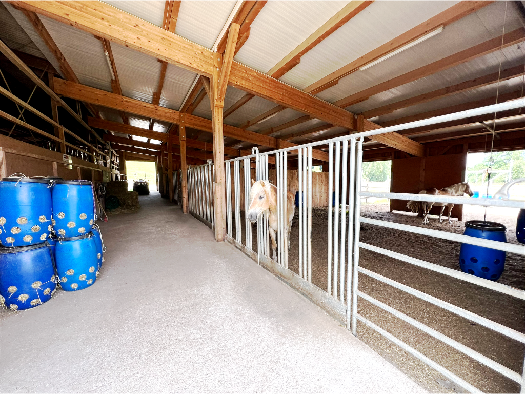 Die Stallungen sind vollständig mit Traktoren befahrbar, was die Arbeit erheblich erleichtert. Das Füttern erfolgt bequem durch Fressgitter, was den Arbeitsaufwand weiter reduziert. Die baulichen Gegebenheiten sind sowohl für die Pferdezucht als Pensionsbetrieb, als auch für einen schulischen Reitbetrieb ausgelegt. Die Reitanlage verfügt über eine moderne Reithalle und eine Reitbahn (ca.240m) welche vielfältigen Trainingsmöglichkeiten bieten. Optional kann ein Reitplatz und Round Pen errichtet werden. Mit zwei Sattelkammern inkl. Reiterstube und ein über den Außenbereich erreichbares WC ist auch für das Wohl des Pferdebesitzers gesorgt. Die Reithalle 35mx18m (Stahlträgerkonstruktion) befindet sich in gutem Zustand und bietet optimale Trainingsbedingungen. Der Offenstall mit Paddock Trails sowie die Oval-Bahn wurden im Jahr 2013 neu errichtet und entsprechen modernen Standards für artgerechte Pferdehaltung.