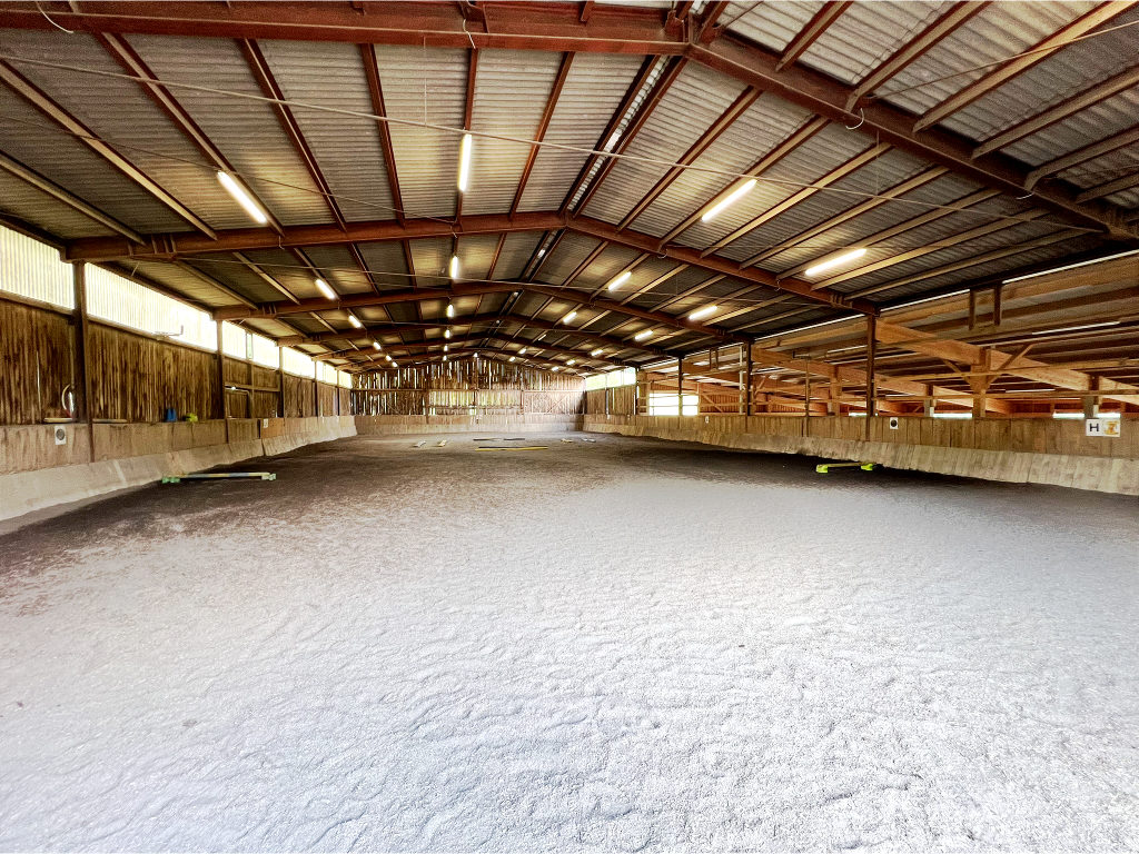 Die Stallungen sind vollständig mit Traktoren befahrbar, was die Arbeit erheblich erleichtert. Das Füttern erfolgt bequem durch Fressgitter, was den Arbeitsaufwand weiter reduziert. Die baulichen Gegebenheiten sind sowohl für die Pferdezucht als Pensionsbetrieb, als auch für einen schulischen Reitbetrieb ausgelegt. Die Reitanlage verfügt über eine moderne Reithalle und eine Reitbahn (ca.240m) welche vielfältigen Trainingsmöglichkeiten bieten. Optional kann ein Reitplatz und Round Pen errichtet werden. Mit zwei Sattelkammern inkl. Reiterstube und ein über den Außenbereich erreichbares WC ist auch für das Wohl des Pferdebesitzers gesorgt. Die Reithalle (Baujahr unbekannt) befindet sich in gutem Zustand und bietet optimale Trainingsbedingungen. Der Offenstall mit Paddock Trails sowie die Oval-Bahn wurden im Jahr 2013 neu errichtet und entsprechen modernen Standards für artgerechte Pferdehaltung.