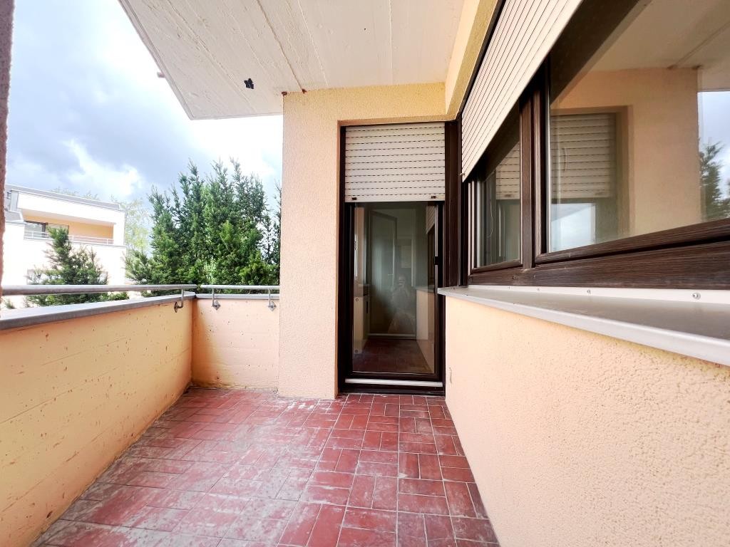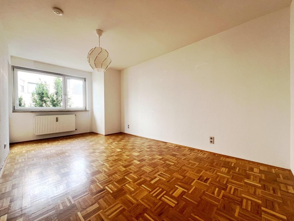 Über das Wohnzimmer gelangt man ebenso wie über das Schlafzimmer auf den westlich ausgerichteten, überdachten Balkon, welcher in Richtung des Innenhofes zeigt. Das Schlafzimmer der Wohnung ist ca. 16 m² groß und bietet somit ausreichend Platz, ein Doppelbett sowie einen Kleiderschrank zusammen einzurichten. Das Mosaik-Parkett, welches sich auch in der restlichen Wohnung wiederfindet, sorgt für ein charmantes Wohngefühl.