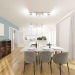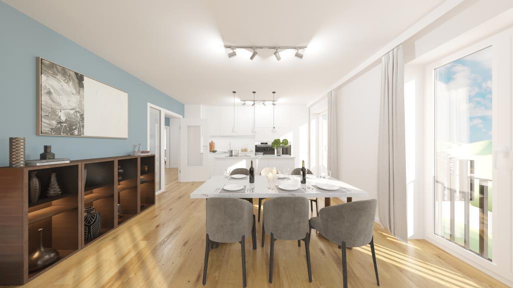 Im Herzen der Wohnung erwartet Sie der offen gestaltete Wohn-/Koch-/Essbereich auf ca. 35,5 m². Die Küche ist so geplant, dass sie sowohl einen zentralen Küchenblock als auch eine großzügige Tafel aufnehmen kann, ergänzt durch eine gemütliche Lounge-Ecke. Großzügige Fenstertüren führen direkt auf die West- und Süd-Terrassen mit insgesamt ca. 13,8 m² bzw. 16,8 m², die den Penthouse-Charakter dieser Wohnung perfekt unterstreichen.