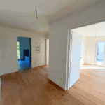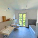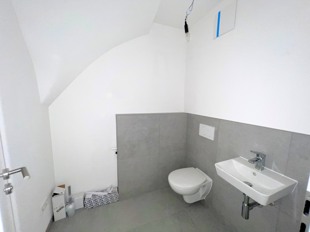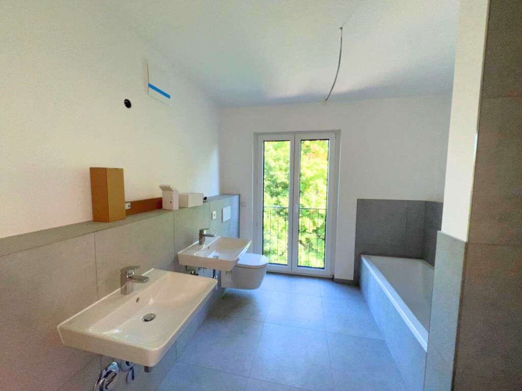 Gegenüber befindet sich das ca. 7,7 m² große Tageslichtbad. Dieses überzeugt durch großformatige Designfliesen in elegantem Dunkelgrau, eine bodengleiche Dusche sowie eine Badewanne – hier trifft modernes Ambiente auf hohen Komfort.