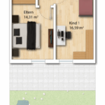 Im ersten Obergeschoss befindet sich ein Tageslichtbad mit bodengleicher Dusche und Badewanne, Toilette, Waschbecken und Handtuchheizkörper. Zudem gibt es auf dieser Etage zwei Kinderzimmer, die ausreichend Platz für Betten, Schränke und Schreibtische bieten. Auch das Elternschlafzimmer kann gut mit einem Doppelbett und einem Schrank möbliert werden.