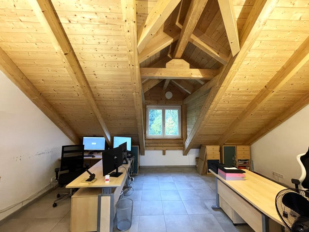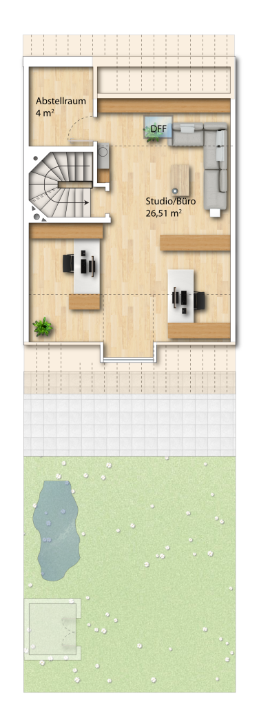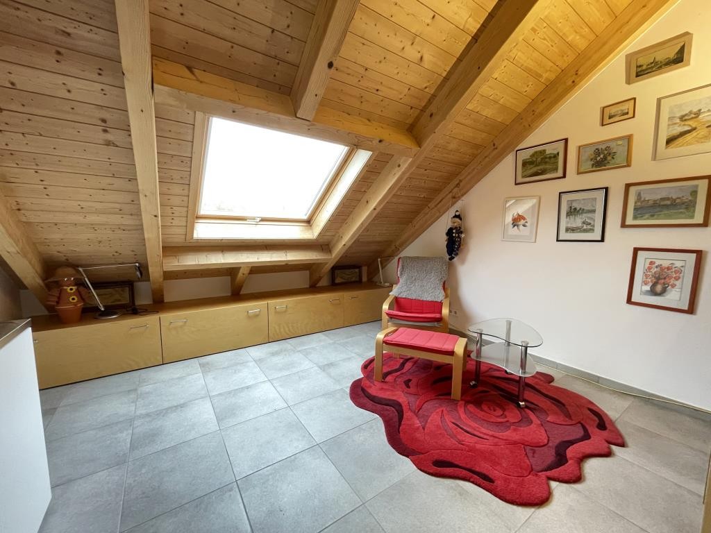 Das Dachgeschoss wurde als Studio gestaltet und kann ideal als Büro bzw. Home-Office genutzt werden. Durch das Dachflächenfenster und dem gegenüberliegenden Fenster kommt viel natürliches Licht in den Raum und gibt einem, in Verbindung mit der Holzdecke, eine gemütliche Atmosphäre. In diesem privaten Bereich finden Sie auch eine kleine Teeküche sowie einen praktischen Abstellraum. Durch die Größe von ca. 26,50 m² besteht auch die Möglichkeit eine Couch zu platzieren und dem stressigen Alltag zu entkommen. Alternativ besteht auch die Möglichkeit die Fläche in zwei abgetrennte Räume aufzuteilen.