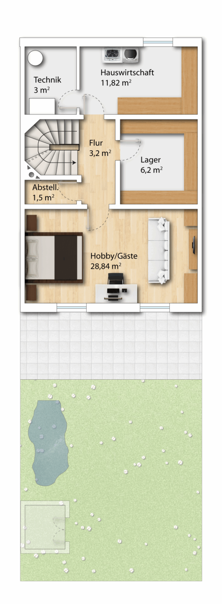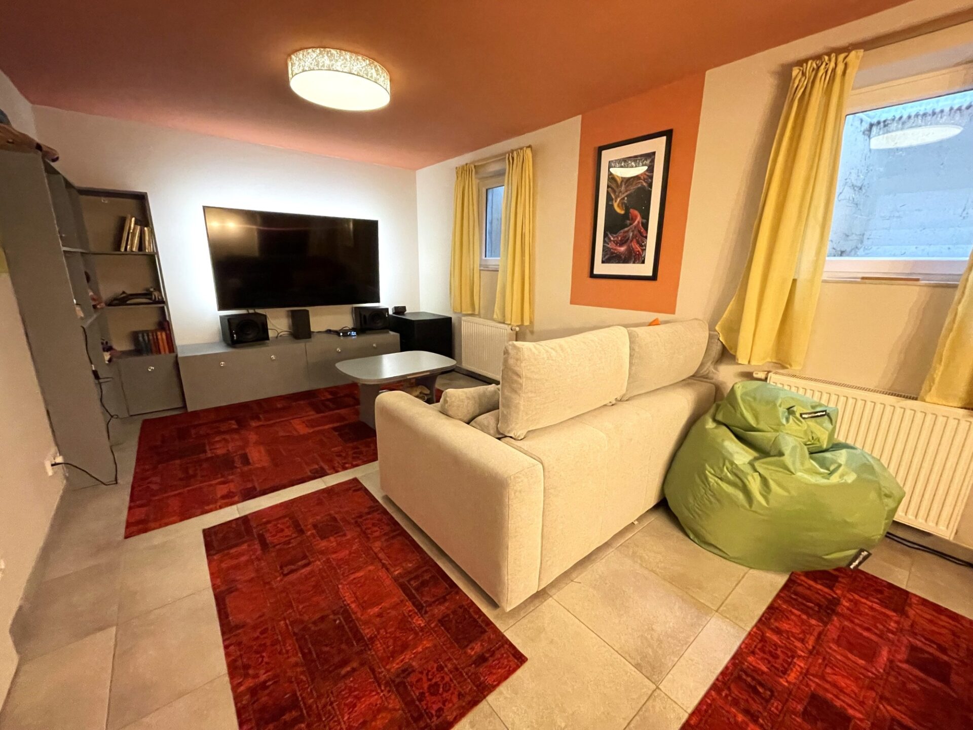 Im Kellergeschoss befindet sich ein ausgebauter Hobbyraum mit großen Fenstern (Wohnraumqualität), der auch als Gästezimmer genutzt werden kann, ein Technikraum, Lagerflächen und ein Hauswirtschaftsraum mit Waschmaschine und Trockner. Zusätzlich stehen ein Außenstellplatz und eine Garage zur Verfügung, um das Auto vor Witterung zu schützen.