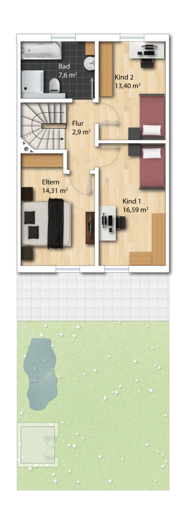 Im ersten Obergeschoss befindet sich ein Tageslichtbad mit bodengleicher Dusche und Badewanne, Toilette, Waschbecken und Handtuchheizkörper. Zudem gibt es auf dieser Etage zwei Kinderzimmer, die ausreichend Platz für Betten, Schränke und Schreibtische bieten. Auch das Elternschlafzimmer kann gut mit einem Doppelbett und einem Schrank möbliert werden.