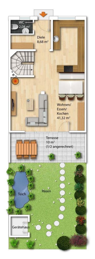 Dieses familienfreundliche Reihenmittelhaus bietet eine Wohnfläche von ca. 147 m² auf einem großzügigen Grundstück von ca. 428 m². Im Erdgeschoss finden Sie eine Diele, ein Gäste-WC mit Fenster und ein geräumiges Wohn- und Esszimmer mit offener Küche, das nicht nur das Herzstück des Hauses darstellt, sondern auch beeindruckende 41 m² misst und damit Einfamilienhauscharakter hat. Der Wohnbereich ist mit einem Schwedenofen für kalte Wintermonate ausgestattet und bietet genug Platz für eine Sofalandschaft, einen Fernseher und einen Essbereich. Die hochwertige Einbauküche, lässt das Herz eines jeden Hobbykochs höherschlagen und ist bereits im Kaufpreis mitinbegriffen. Vom Wohnzimmer aus gelangen Sie zur Süd-West Terrasse und in den eigenen, schön eingewachsenen Garten, der sogar einen Fischteich und ein Gerätehaus zu bieten hat.
