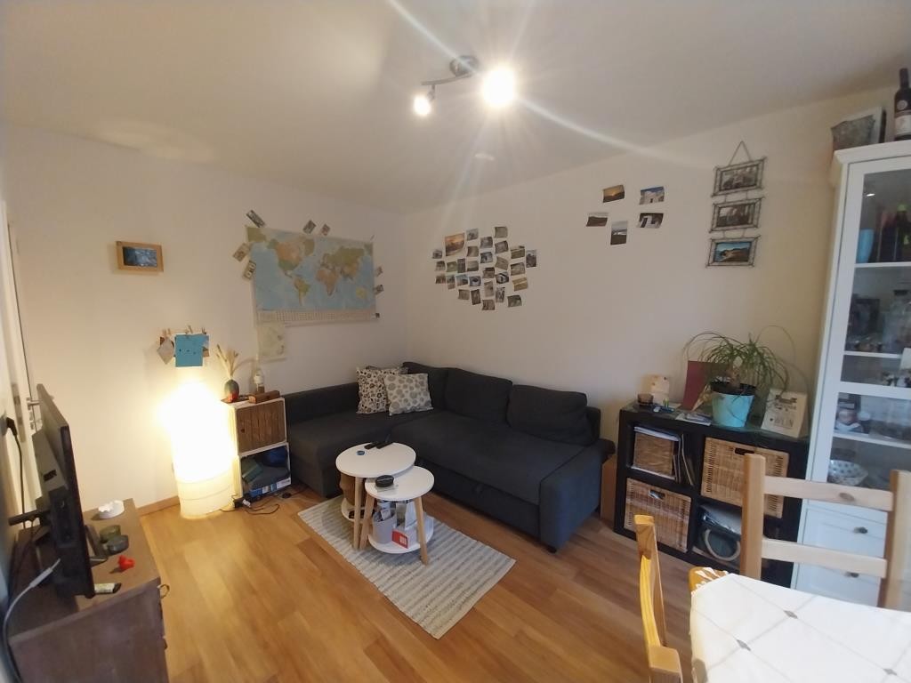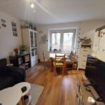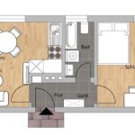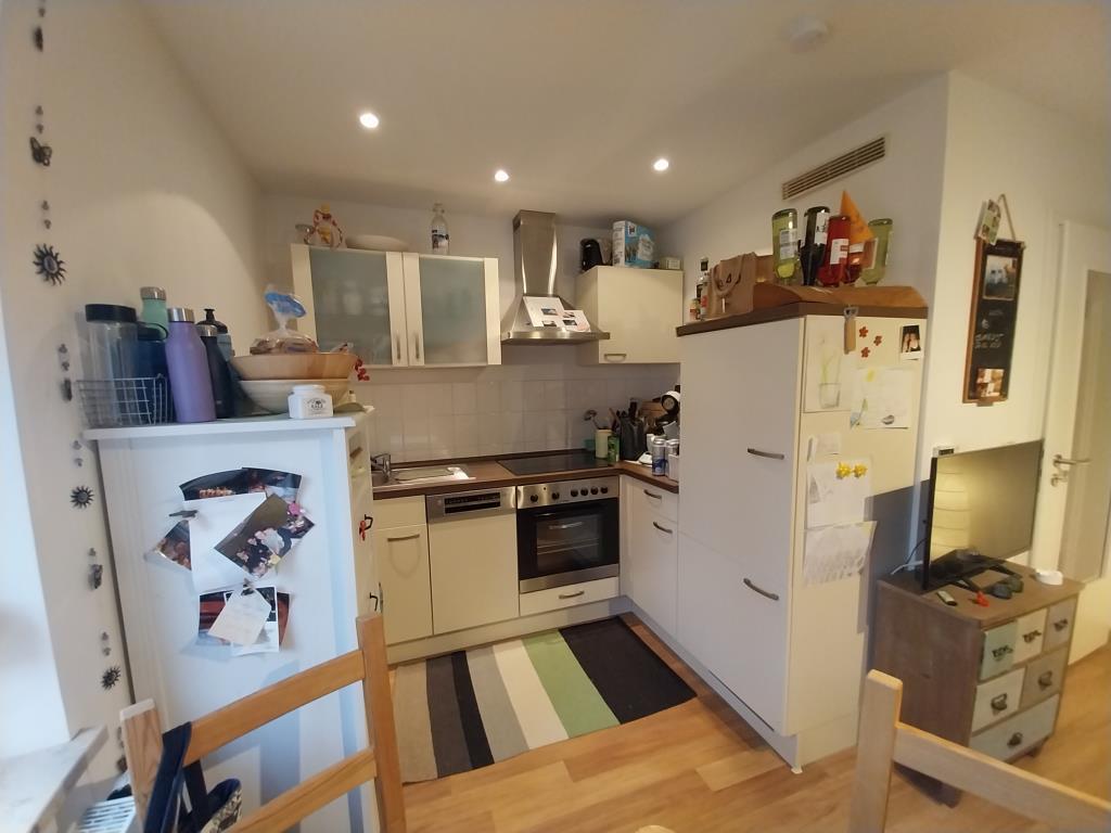 Ein zentraler Flur schafft Zugang zu allen Räumen und bietet zudem Platz für die Einrichtung einer Garderobe. Linker Hand des Wohnungseingangs gelangt man in die Wohnküche. Auf 15,55 m² Raumgröße finden eine Küchenzeile mit üblicher Ausstattung wie Kühlschrank, Backofen, Spülmaschine und Hängeschränken wunderbar Platz. Die aktuell verbaute Küche ist Eigentum des derzeitigen Mieters und kann für eine Ablöse in Höhe von 1.500,00 EUR abgelöst werden. Der Wohnbereich ist mit einem Laminatboden ausgestattet. Eine gemütliche Eck-Couch mit gegenüberliegendem TV und ein Esstisch machen den Raum zum Mittelpunkt der Wohnung.