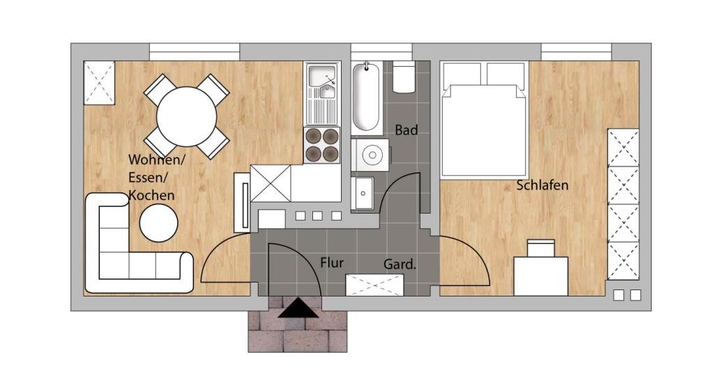 Im südlichen Stadtteil Galgenberg in einem 9-Parteienhaus gelegen, befindet sich die Wohnung im Erdgeschoss in südlicher Ausrichtung. Die Wohnung kann ausschließlich über das Treppenhaus erreicht werden, da kein Aufzug vorhanden ist.