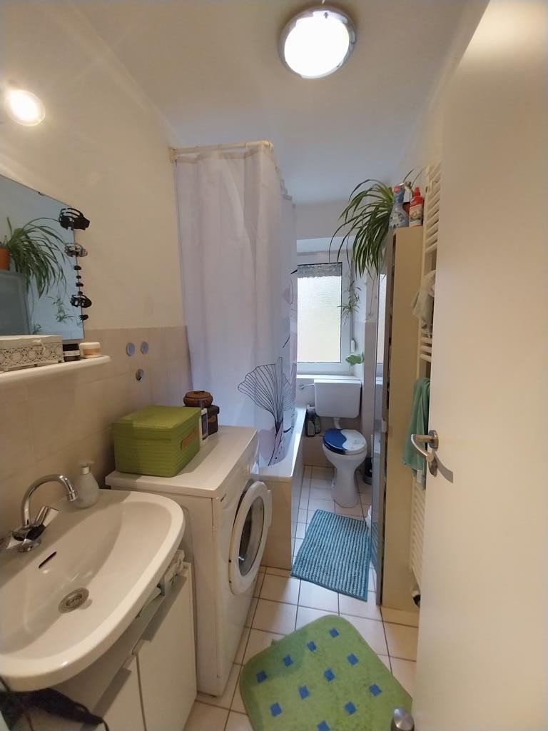 Weiter im Flur gelangt man in das Badezimmer der Wohnung. Ein Fenster sorgt für eine natürliche Belichtung und die Möglichkeit der Frischluftzufuhr im Bad. Die Badewanne mit Duschfunktion, ein Handtuchheizkörper sowie der stimmige Fliesenboden ergänzen die übliche Badausstattung von Waschbecken und WC.