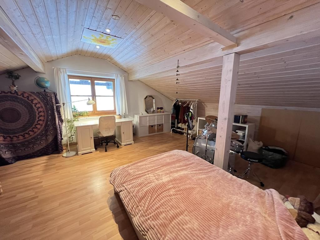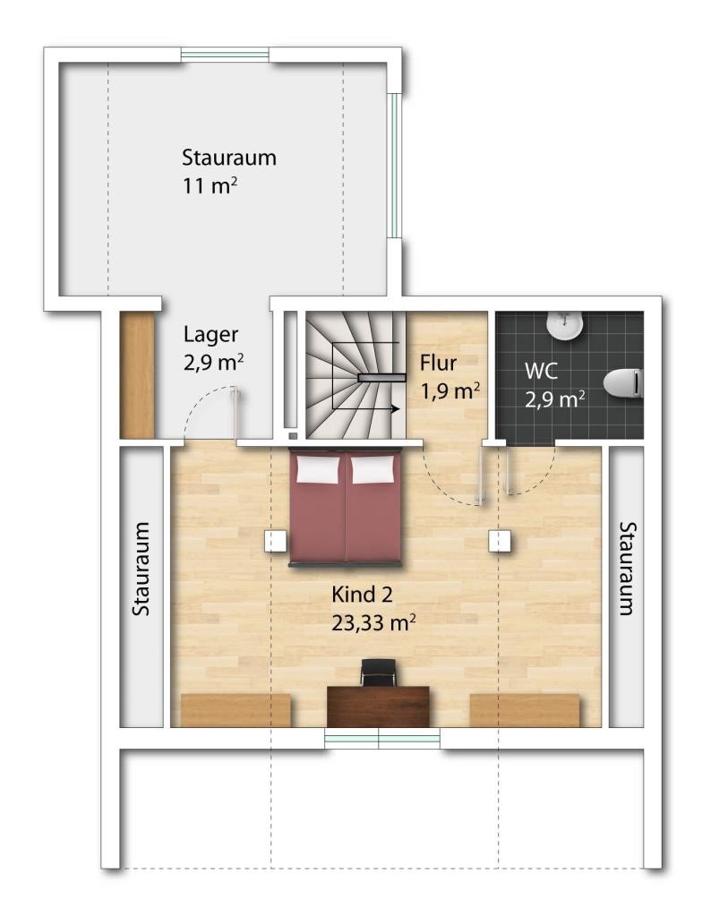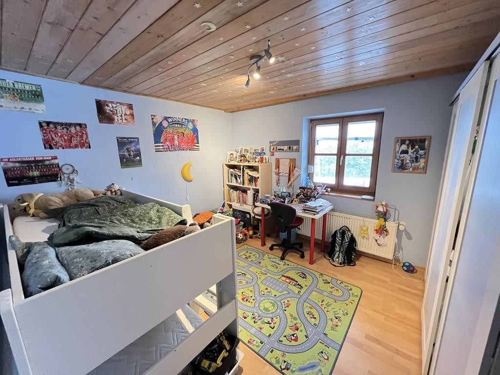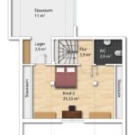 Über eine Treppe gelangen Sie in das Obergeschoss, welches mit einem großzügigen Kinderzimmer samt eigenem WC ausgestattet ist. Der Raum bietet zahlreiche Nutzungsmöglichkeiten – ob als Spielzimmer, Home-Office oder Hobbyraum. Ergänzt wird diese Etage durch einen angrenzenden Lagerraum sowie einen großen Stauraum, der zusätzlichen Platz für Ordnung schafft.