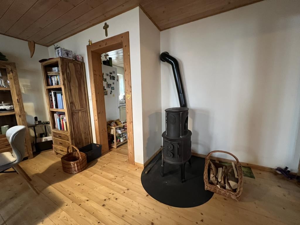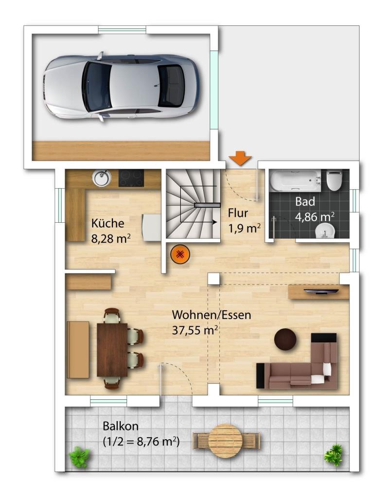 Beim Betreten des Hauses gelangen Sie über den Flur direkt in den offenen Wohn- und Essbereich mit ca. 37,55 m². Ein Holzofen in der Mitte des Raumes sorgt für eine gemütliche Atmosphäre und macht den Wohn- und Essbereich zum Herzstück des Hauses. Die angrenzende Küche fügt sich harmonisch in das offene Konzept ein. Die Einbauküche ist im Preis enthalten. Ebenfalls im Erdgeschoss befindet sich ein belichtetes Badezimmer mit einer Badewanne inklusive Duschfunktion. Vom Wohnzimmer aus gelangen Sie auf den Balkon, der mit einem einzigartigen Blick auf den Garten und die umliegende Natur begeistert.