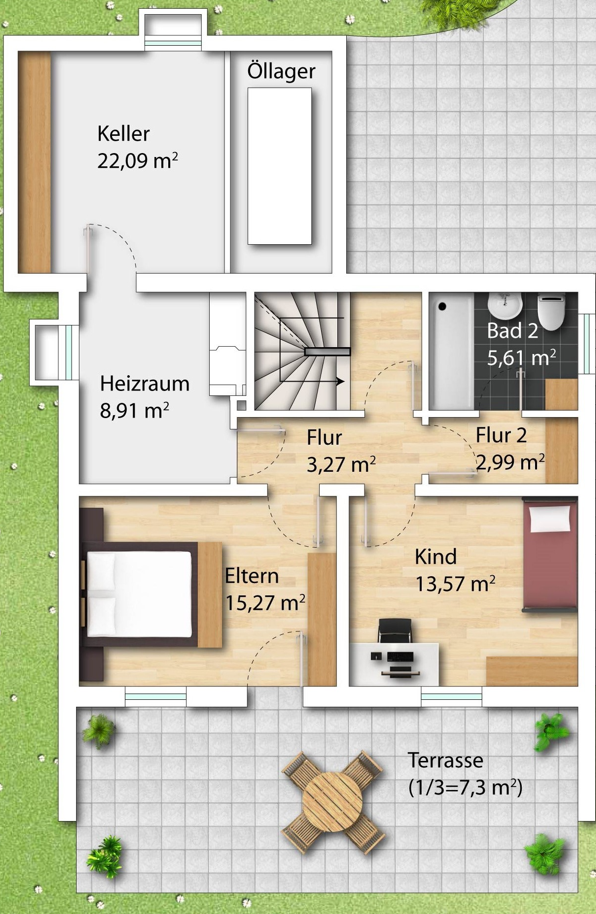 Im Untergeschoss erwartet Sie ein weitläufiges Elternschlafzimmer sowie ein weiteres Kinderzimmer. Ein zusätzliches Badezimmer mit Dusche sorgt für Komfort auf dieser Ebene. Über das Elternschlafzimmer gelangen Sie auf eine schöne Terrasse, an die ein großer Garten angrenzt, der mit seiner Weitläufigkeit viele Möglichkeiten zur individuellen Gestaltung bietet. Zudem befinden sich auf dieser Ebene ein Heizraum sowie ein Kellerraum mit zusätzlicher Nutzfläche.