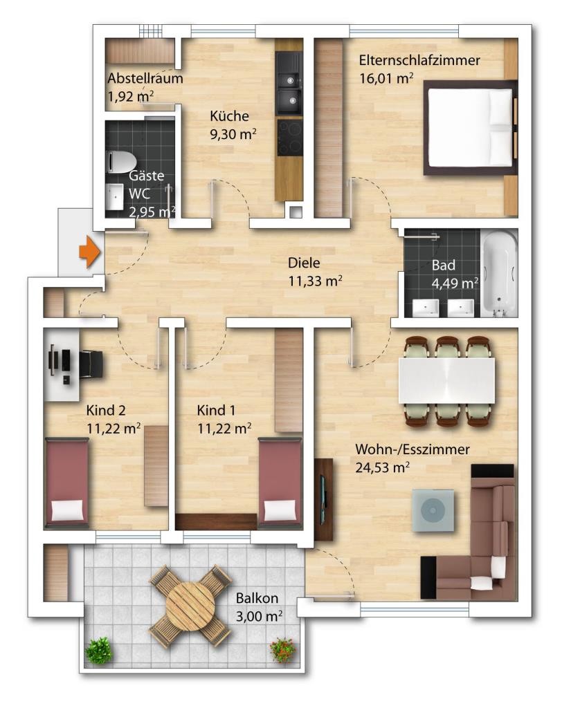 Auch die beiden Kinderzimmer mit jeweils ca. 11,22 m² profitieren von einem Fenster in Richtung des Balkons und sind demnach sehr gut belichtet. Das Elternschlafzimmer mit ca. 16 m² hat die ideale Größe und den Raumsschnitt für die Platzierung eines 1,80 m breiten Doppelbettes und ist aufgrund eines großen Fensters ebenso gut von Tageslicht verwöhnt. Die Wohnung verfügt über den Komfort eines Badezimmers mit Wanne und einem separaten WC; beides ist dabei innenliegend. Der Waschmaschinenanschluss befindet sich direkt in der Wohnung selbst im WC-Raum.