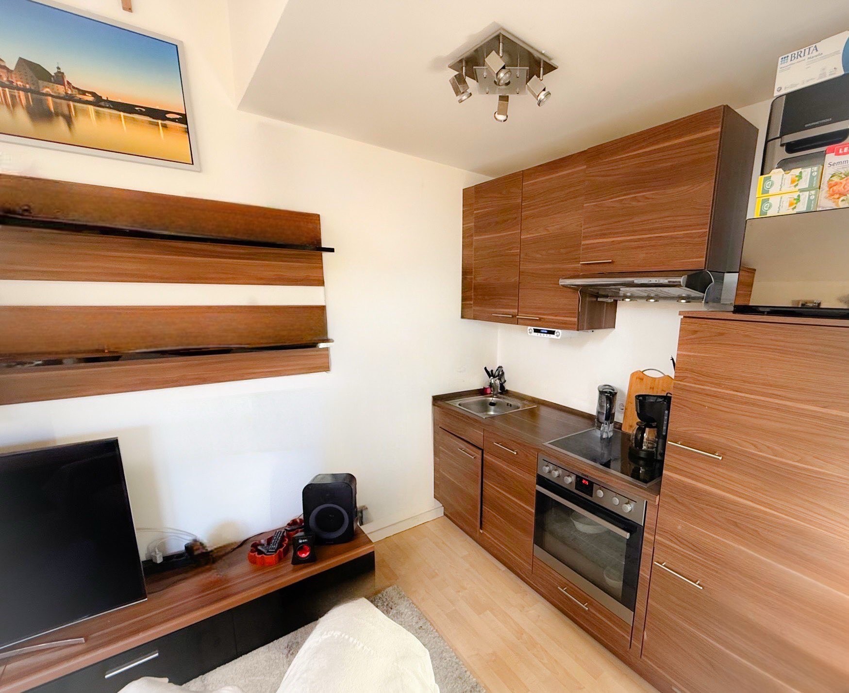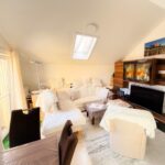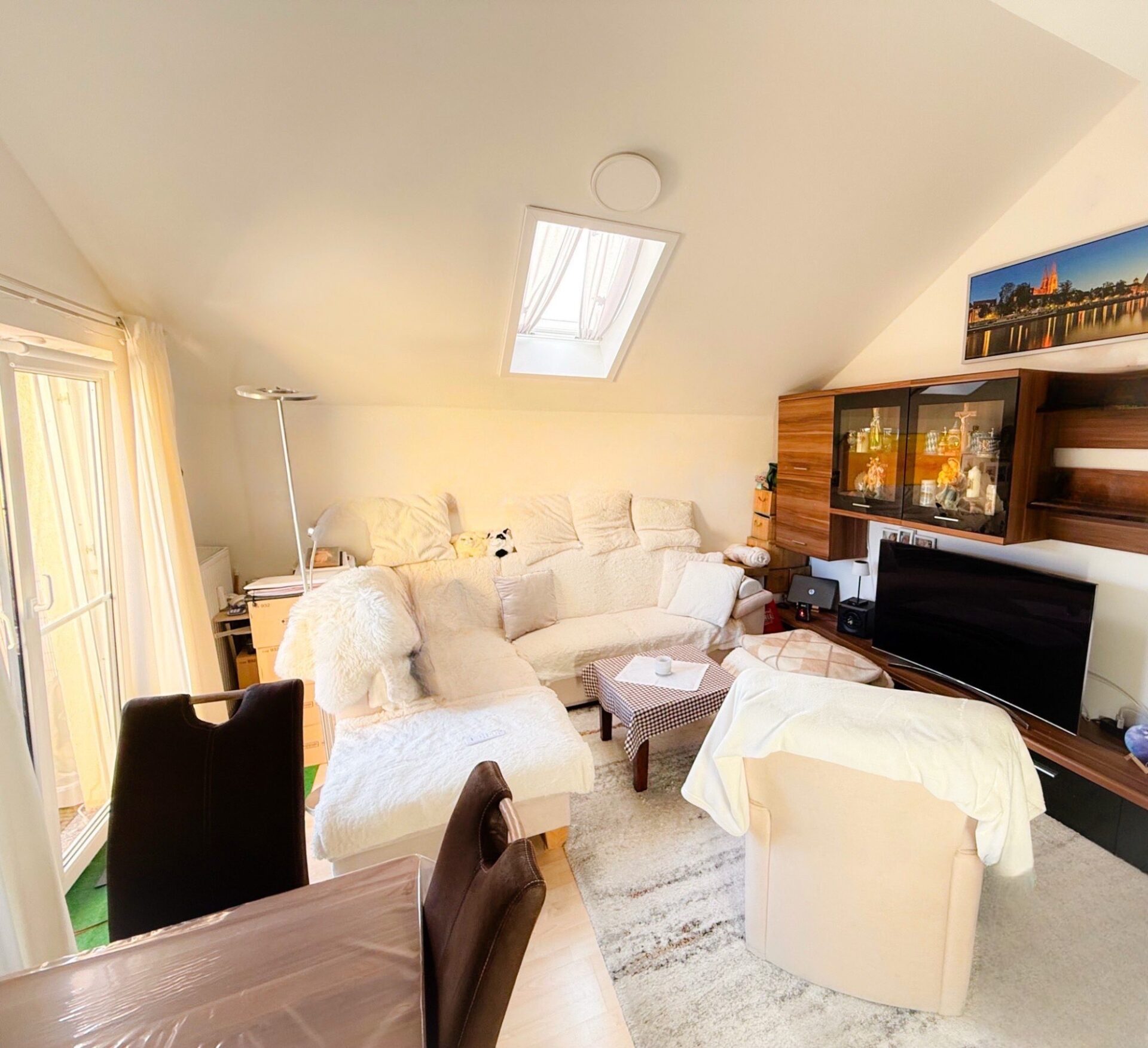 Der Wohn- und Essbereich mit offener Küche (19,87 m²) bildet das Herzstück der Wohnung. Dank der großen, doppelflügeligen Balkontür, eines zusätzlichen Dachfensters und der durch die Dachschräge entstehenden Raumhöhe von etwa drei Metern am höchsten Punkt wirkt dieser Bereich besonders hell und einladend – ideal für alle, die eine lichtdurchflutete und offene Raumgestaltung schätzen.