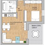 Beim Betreten der Wohnung gelangen Sie in einen optimal genutzten Eingangsbereich, der Zugang zum Badezimmer, Schlafzimmer sowie zum offenen Wohn-, Ess- und Kochbereich bietet.