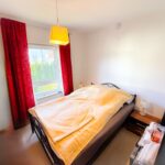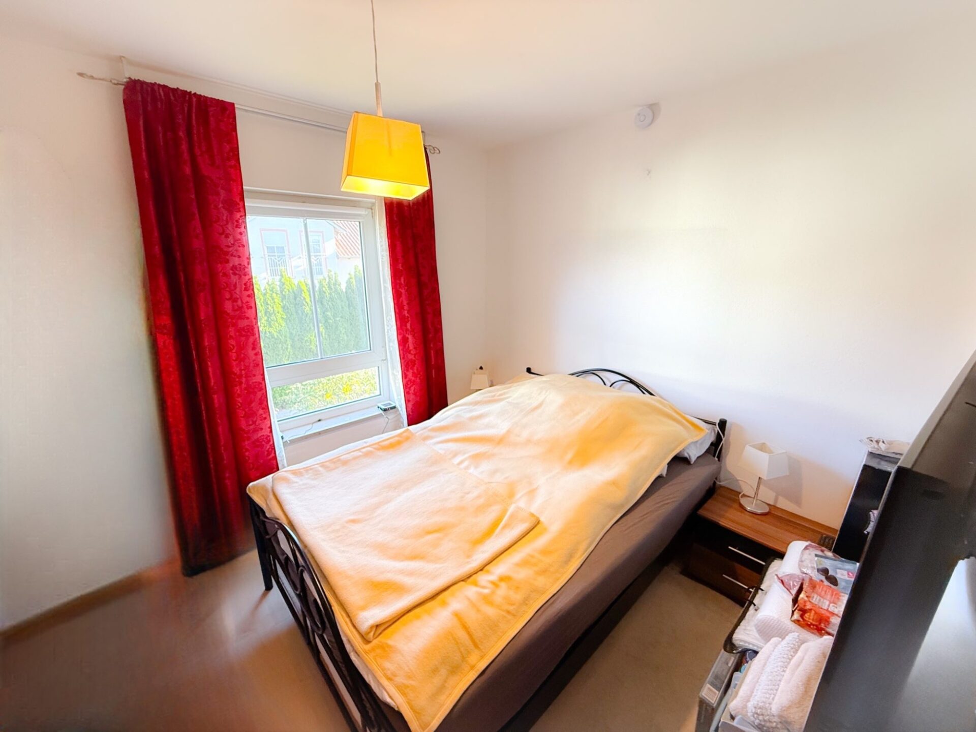 Das durch ein großes Fenster freundlich und hell wirkende Schlafzimmer (11,74 m²) bietet ausreichend Platz für ein Doppelbett, einen geräumigen Kleiderschrank sowie ein praktisches Sideboard.