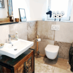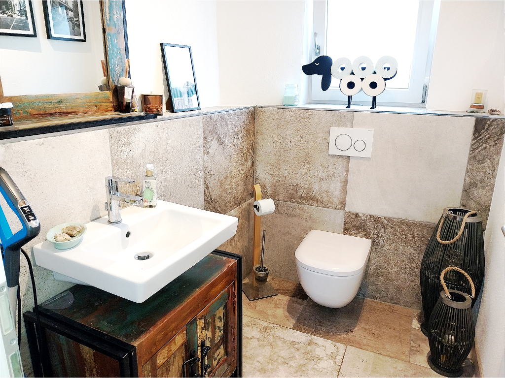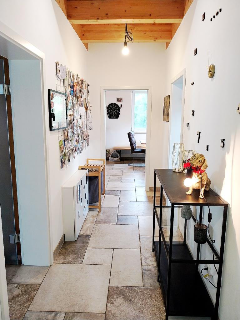 Eine großzügige, offen gestaltete Diele mit ca. 13 m² empfängt einen nach Betreten und führt zentral in alle weiteren Räume im Erdgeschoss. Der Fliesenboden in Natursteinoptik sowie die Sichtbalken schaffen unmittelbar eine gemütliche Atmosphäre. Der Eingangsbereich verfügt zudem über ein Gäste-WC.