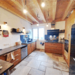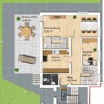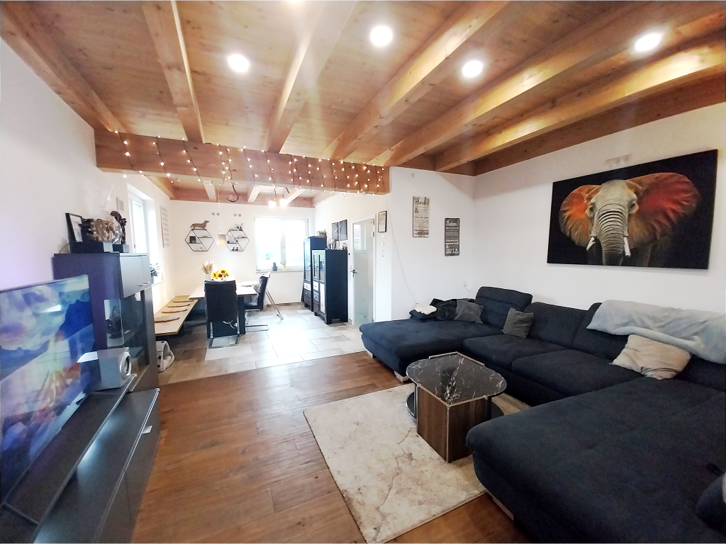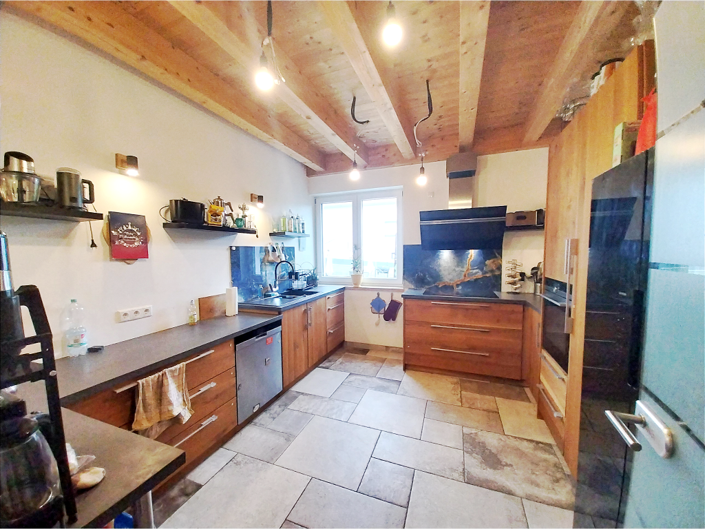 Im Erdgeschoss befindet sich außerdem ein Arbeitszimmer mit ca. 9 m², welches danke der Ausstattungsdetails einer Glastüre, des Echtholz-Parketts sowie der Sichtbalken ein ansehnlicher Rückzugsort zum Arbeiten darstellt. Die separate Küche mit ca. 13 m² ist mit einer modernen Küche aus Schreinerhand ausgestattet. Eine überdurchschnittlich großzügige Arbeitsplatte, ein schräger Dunstabzug sowie ein Backofen auf Arbeitshöhe machen die Küche unter anderem zu einer familienfreundlichen Kochoase. Die Küche ist dabei im Gesamtkaufpreis enthalten. Das Highlight der Wohnung stellt der besonders helle Wohn-/Essbereich mit ca. 33 m² dar. Nicht nur die beliebige Möblierung sondern auch der fortgeführte Charme der Sichtbalken mit LED-Spots schaffen so den Mittelpunkt der Wohnung. On top gelangt man über das Wohnzimmer auf das ca. 24 m² große, überdachte Terrassenplateau mit Blick auf den privaten Garten mit über 460 m².