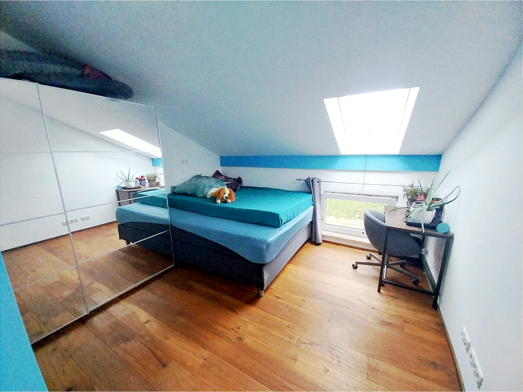Im 1.Obergeschoss setzt sich das gemütliche Wohngefühl fort. Ein Familienbad auf ca. 10,5 m² lässt dank der Eckbadewanne, der gemauerten Regendusche, dem Dachflächenfenster sowie dem XXL-Waschtisch keine Wünsche offen. Zwei Kinderzimmer mit einer Raumgröße von je ca. 12 m² und 8 m² schaffen Rückzugsorte für die Kids oder ermöglichen die Einrichtung eines weiteren Gäste-/Arbeitszimmers. Das Elternschlafzimmer mit ca. 19 m² und angrenzender Ankleide mit ca. 4,3 m² zeigt wiederholt den vorzughaften Grundriss. Die gesamte Wohnung ist mit Fußbodenheizung und dreifachverglasten Kunststoff-Fenstern, die über elektrische Rollläden verfügen, ausgestattet. Es ist darüber hinaus eine Lüftungsanlage mit Wärmerückgewinnung vorhanden. Die vorhandene PV-Anlage dient der Allgemeinheit, wird ins öffentliche Netz eingespeist und wirft auf die verkaufte Wohnung einen monatlichen Betrag von 172 EUR ab.