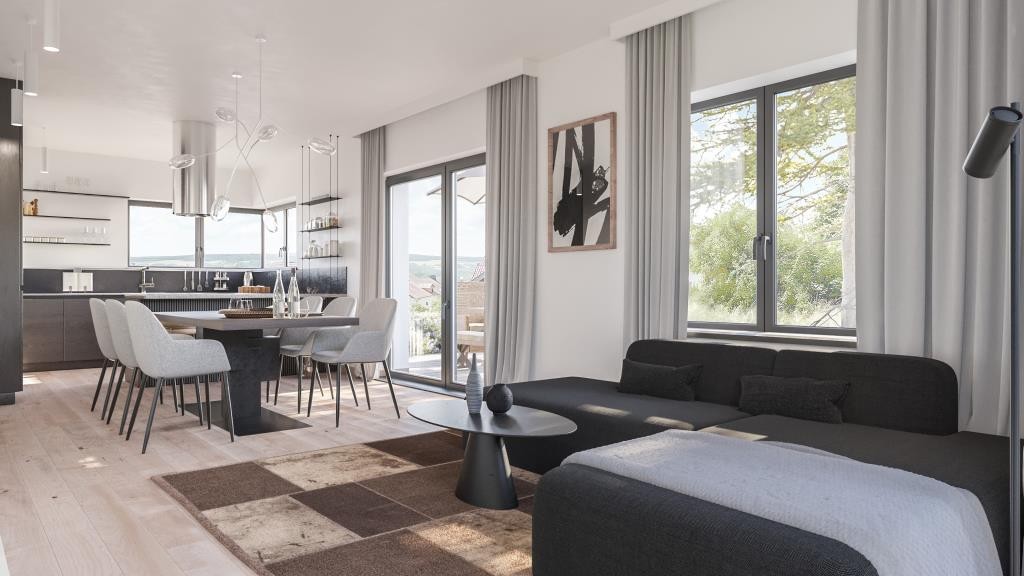 Der Bodenbelag kann nach individuellen Wünschen bemustert werden, wobei Parkett- oder Vinylboden zur Auswahl steht. Alle Innen-Fensterbänke im Haus werden mit 3-cm starken Jura-Marmorplatten ausgestattet.