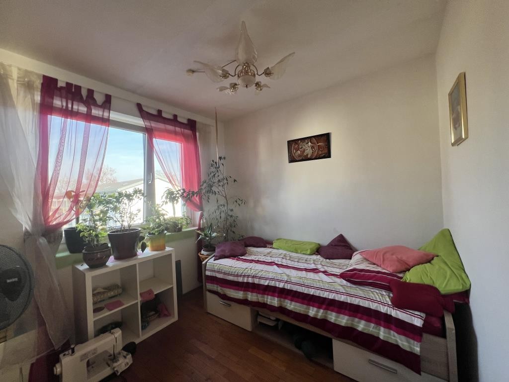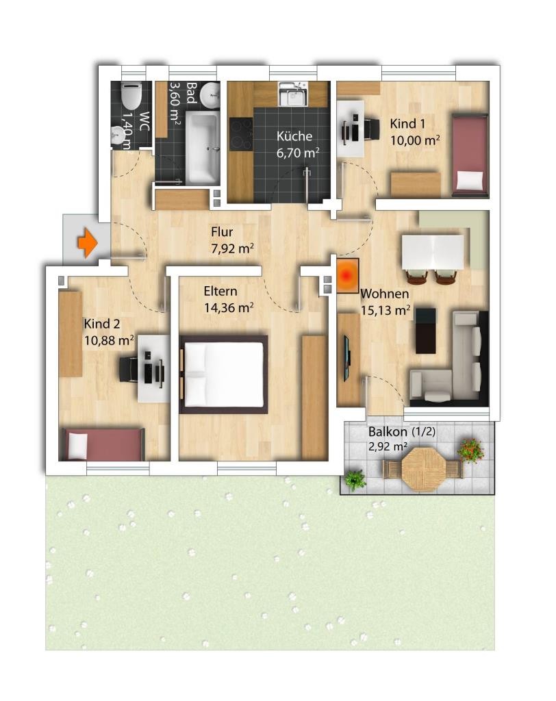 Ein zentraler Flur bietet mit ca. 8 m² Platz für eine Garderobe und ermöglicht den Zugang zu allen weiteren Räumen. Die Zonierung der Wohnung ist maximal durchdacht und bietet unter anderem auch Familien mit 2 Kindern ein schönes Zuhause. Die beiden circa gleichgroßen Kinderzimmer mit ca. 10 m² sind angenehm hell und lassen sich ideal mit einem Bett, einem Schreibtisch sowie einem Schrank möblieren. In beiden Kinderzimmern findet sich ein Echtholz-Bodenbelag wieder. Das Elternschlafzimmer mit ca. 14 m², welches mit Laminatboden ausgestattet ist, verfügt dabei über genügend Fläche für ein großzügiges, 180 cm breites Doppelbett und einen ausgiebigen Kleiderschrank. Das Wohnzimmer ist das Herzstück der Wohnung: Mit einer Größe von ca. 15 m² kann eine gemütliche Eckcouch mit gegenüberliegendem TV zusammen mit einem Esstisch eingerichtet werden. Außerdem gelangt man über das Wohnzimmer auf den Süd-Balkon, welcher unmittelbar ins angrenzende Grün zeigt und zum Durchatmen einlädt. Im Wohnzimmer sind ebenso Holzdielen verlegt. Die Küche der Wohnung ist separat gestaltet und verfügt über alle notwendigen Ausstattungselemente: Kühlschrank, Backofen, Kochfeld, Waschmaschinenanschluss und ausreichend Stauraum. Die Warmwasseraufbereitung erfolgt hierbei über einen Boiler.