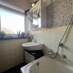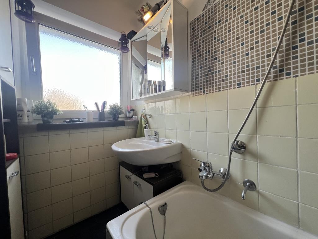 Das Badezimmer erscheint dank des hellen Fliesenspiegels an der Wand und dem Anthrazit-farbenen Bodenbelag zeitlos und gepflegt. Das große Fenster und die Badewanne mit Duschfunktion ergänzen den angenehmen Komfort. Das WC befindet sich separat unmittelbar neben dem Badezimmer und verfügt ebenfalls über ein Fenster.