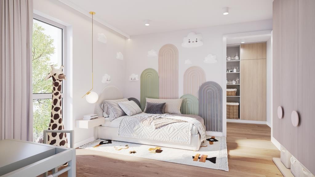 Das Obergeschoss ist aufgeteilt in zwei Kinderzimmer mit bis zu über 14 m², einem Elternschlafzimmer inklusiver großzügiger Schrankfläche mit fast 19 m², einem Hauswirtschaftsraum mit Waschmaschinen – und Trockneranschluss, einem praktischen Abstellraum sowie ein Familienbad mit Tageslicht, bodengleicher Dusche und Badewanne mit über 11 m².
