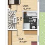 Ein Kinderzimmer mit einer beachtlichen Wohnfläche von ca. 19,5 m² liegt ebenfalls auf dieser Etage. Dank der Raumgröße ist der Möblierung keine Grenze gesetzt. Ebenfalls im 1. OG befindet sich das Familienbadezimmer. Ausgestattet mit einer Badewanne, einer Eckdusche sowie einem Waschbecken und WC ist jeglicher Komfort vorhanden. Ergänzt wird dieser durch ein großes Fenster, welches für Tageslicht und Frischluft sorgt.