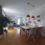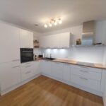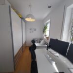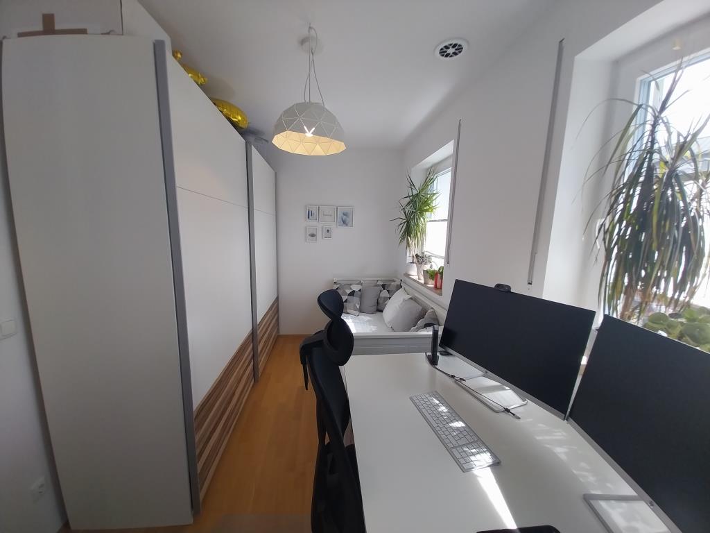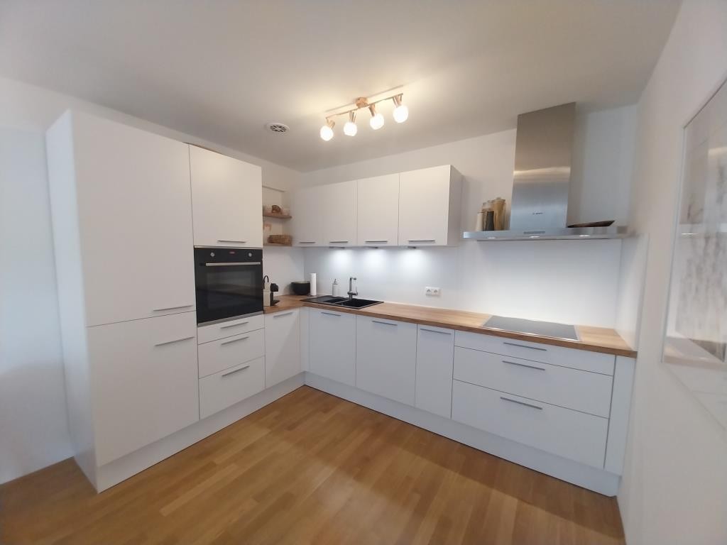 Der offen gestaltete Wohn-/Koch-/Essbereich ist mit einer Raumgröße von ca. 32 m² das Herzstück der Wohnung, was besonders durch den ca. 10 m² großen Süd-Westloggia unterstrichen wird. Neben einer gemütlichen Eckcouch kann ein Essbereich mit Blick in die offene Küche eingerichtet werden. Der fließende Übergang in den Kochbereich lädt zu geselligen Kochabenden mit Freuden und Familie ein. Die im Kaufpreis enthaltene Einbauküche in L-Form mit mattweißen Fronten und Holzarbeitsplatte ist in einem einwandfreien Zustand und bestens ausgestattet mit einer Kühl-/Gefrierkombination, einem Herd und Backofen, einer Spülmaschine sowie ausreichend Stauraum.Vollständig wird die Wohnung durch ein ca. 8 m² großes Arbeitszimmer, welches neben einem Schreibtisch ausreichend Platz für einen Schrank sowie eine Gästecouch bietet.