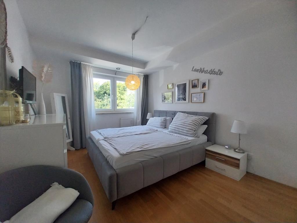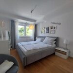 Das Schlafzimmer ermöglicht dank der Raumgröße von ca. 14 m² eine individuell gestaltbare Möblierung mit einem Doppelbett sowie einem üppigen Kleiderschrank. Die großzügige Verglasung nach Westen schafft – wie auch in den weiteren Räumen – eine auffallend gute Belichtung.
