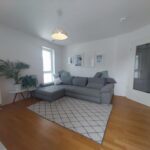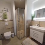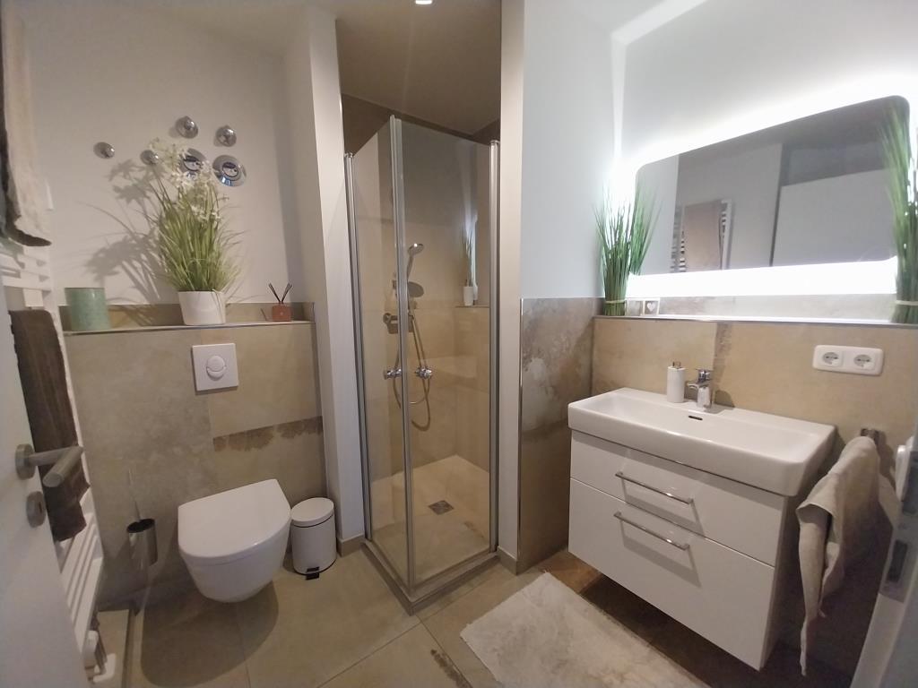 Im angrenzenden Badezimmer setzt sich der Wohnkomfort auf ca. 6 m² fort. Eine bodengleich geflieste Eckdusche mit Glasbine präsentieren sich durch die großformatigen Fliesen in Natursteinoptik ideal. Der Handtuchheizkörper, das WC sowie ein großer Einzelwaschtisch machen das Badezimmer zusammen mit dem Waschmaschinenanschluss vollständig.