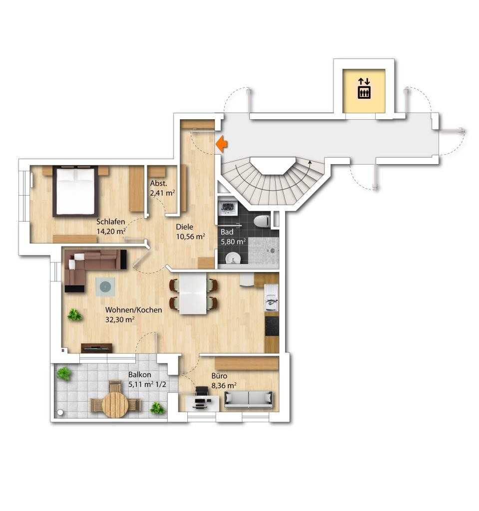 Bereits im Eingangsbereich zeigt sich die Wohnung nicht nur von ihrer optisch ansprechenden, sondern auch praktischen Seite: Auf ca. 10,56 m² kann ein großzügiger Garderobenschrank platziert werden. Ebenso befindet sich ein praktischer Abstellraum mit ca. 2,41 m² im Dielenbereich.