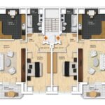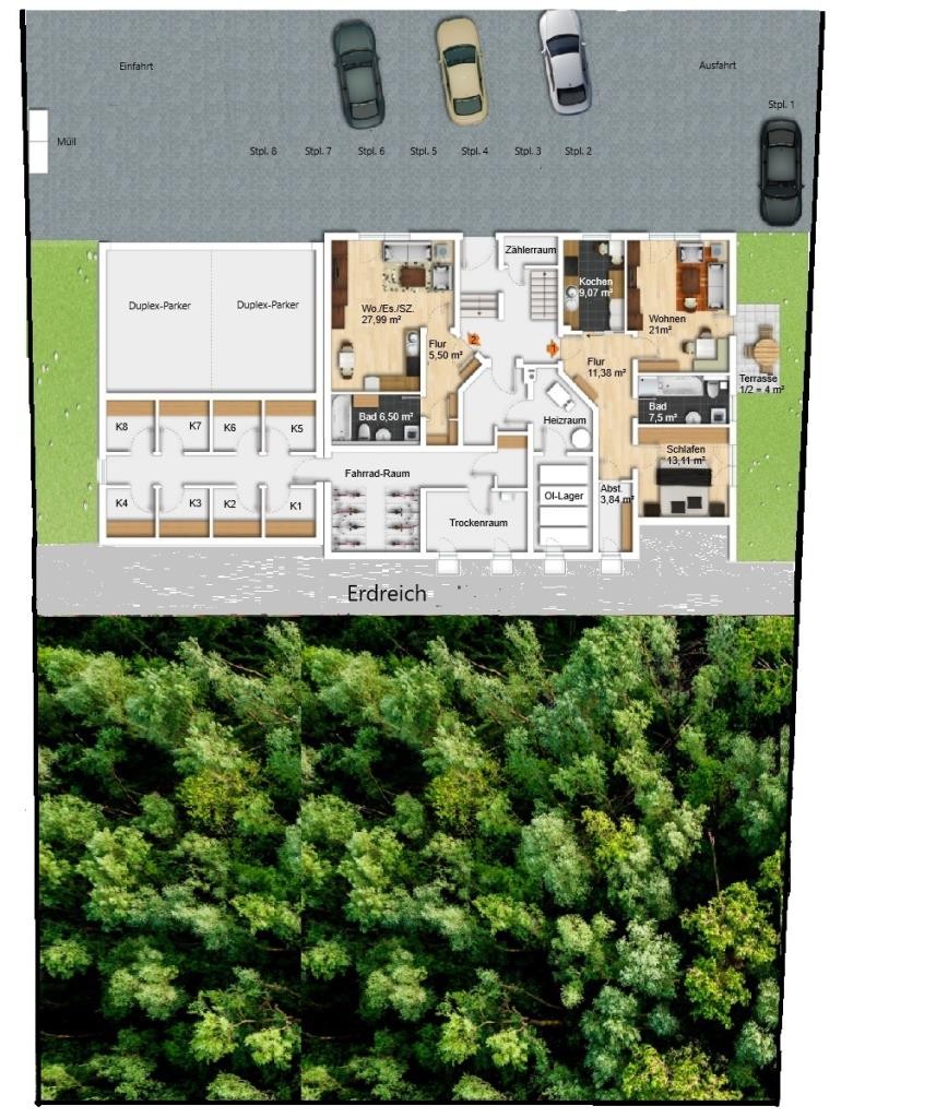 Die Grundrisse der einzelnen Wohnungen können den nachfolgenden Abbildungen entnommen werden. Zudem ist jeder Wohnung ein Kellerraum sowie ein Duplex-Stellplatz bzw. ein Außenstellplatz zugeteilt. Das Haus verfügt außerdem über einen Fahrrad-Raum sowie einen Wasch-/Trockenraum, in welchem jede Einheit seine eigene Waschmaschine anschließen kann. Wichtige energetische Gegebenheiten wie eine Außendämmung oder zweifachverglaste Kunststofffenster sind vorhanden. Am Haus selbst ist keine Sanierungsmaßnahme ausstehend, jedoch sind derzeit 4 von 8 Duplexeinheiten defekt.