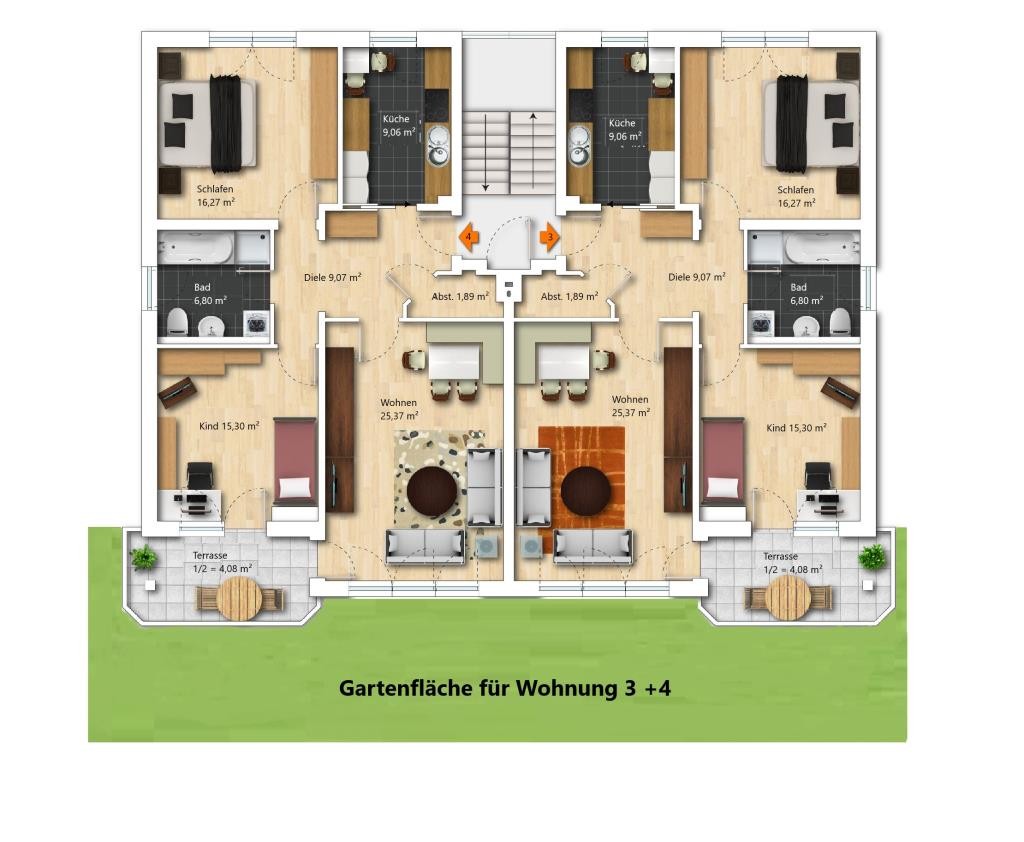 – Wohnung 1/ EG links, 2-Zimmer Wohnung mit Ost-Terrasse und eigenem Garten mit einer Gesamtgröße von ca. 66 m²