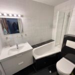 Duschbadewanne, Toilette und einem großen Waschbecken ausgestattet ist.
