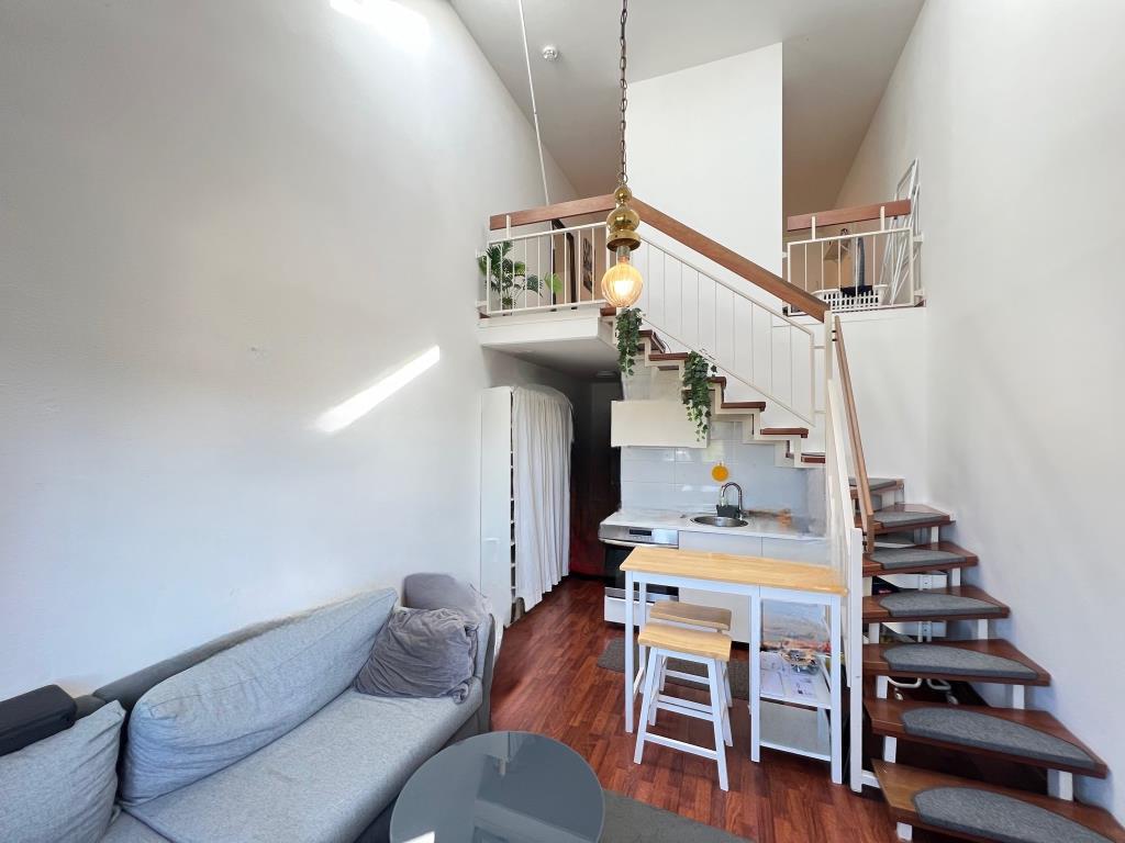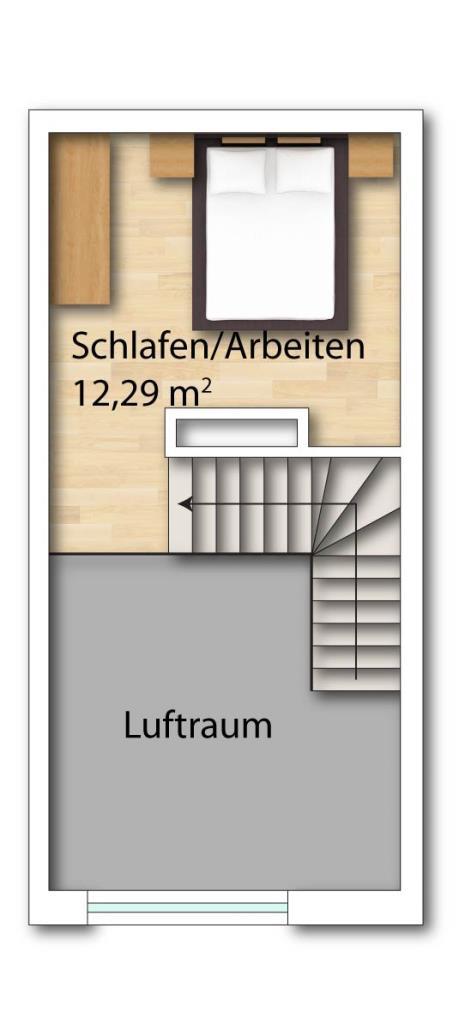 Über die Treppe erreichen Sie die Galerieebene mit ca. 12,3 m², die als Schlafzimmer dient. Hier finden ein