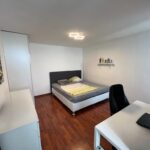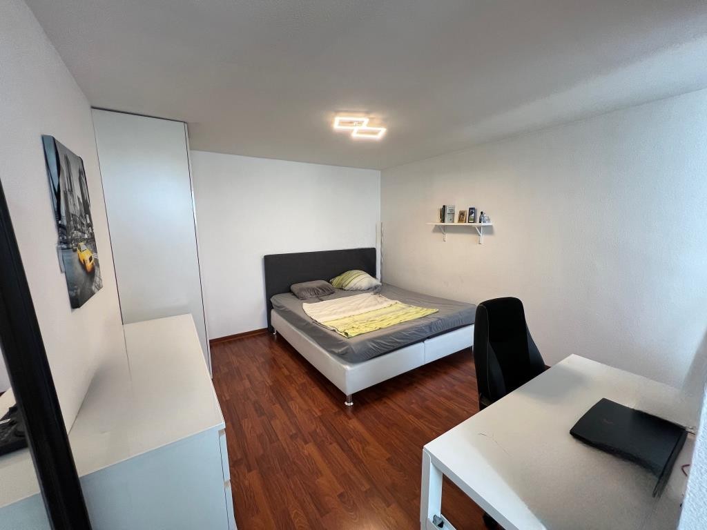 großes Doppelbett, ein geräumiger Kleiderschrank sowie ein Schreibtisch bequem Platz – ideal als