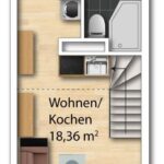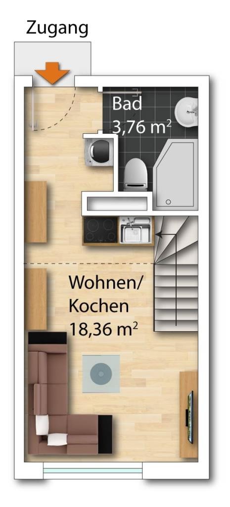 Treppe integriert, sodass kein zusätzlicher Wohnraum beansprucht wird und der Wohnbereich optimal