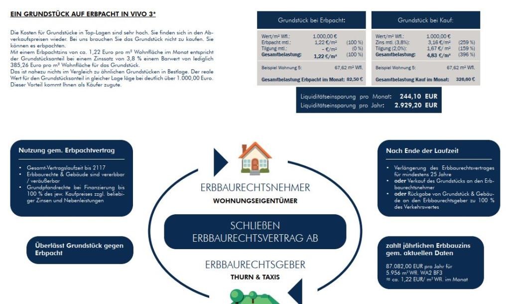 Wichtig: Das Objekt befindet sich auf dem Grundstück des Regensburger Fürstenhauses „Thurn & Taxis“ und wird auf Erbpacht-Basis (99 Jahre Laufzeit) verkauft. Der monatliche Erbpachtins dieser Wohnung beläuft sich auf 74,83 EUR (Index-gebunden).