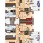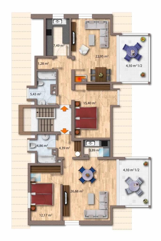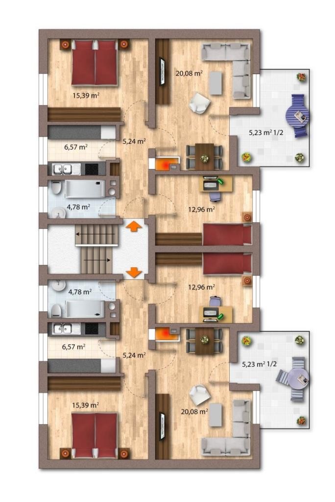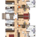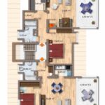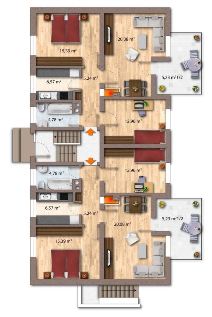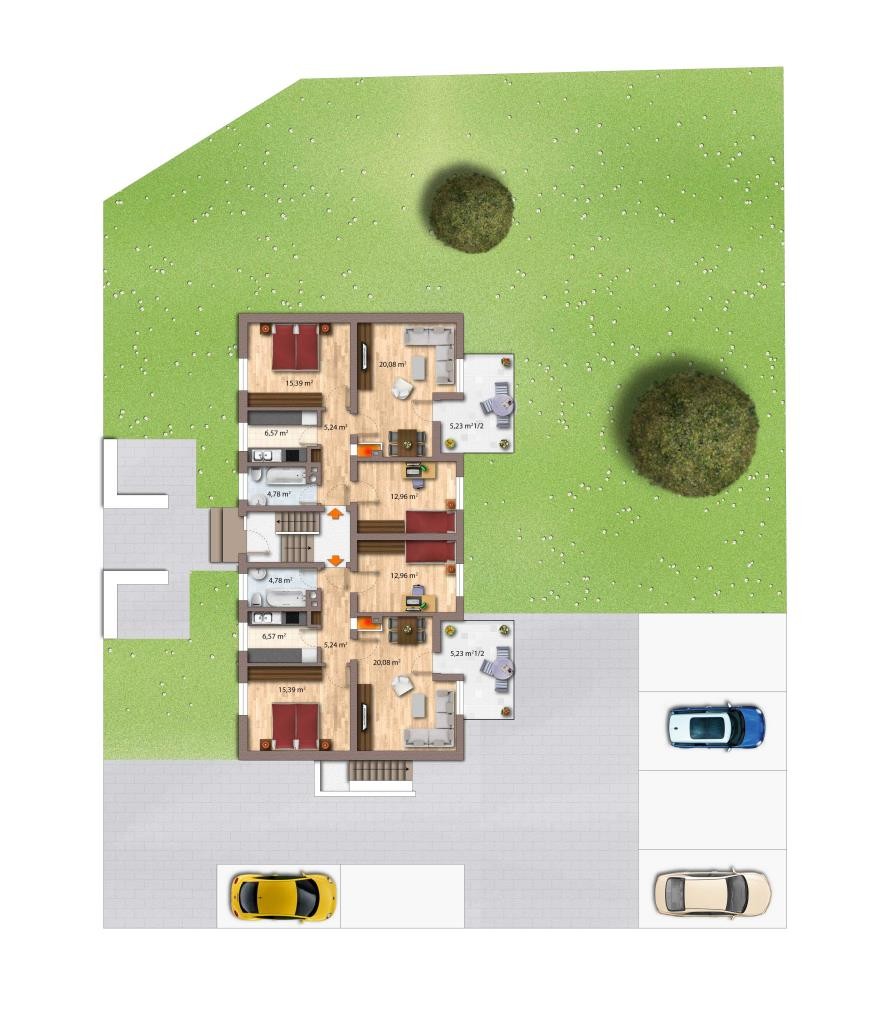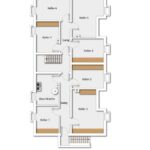 Die Grundrisse der einzelnen Wohnungen können den nachfolgenden Abbildungen entnommen werden. Zudem ist jeder Wohnung ein Kellerraum sowie eine Garage bzw. ein Außenstellplatz zugeteilt. Das Haus verfügt außerdem über einen Fahrrad-Raum sowie einen Wasch-/Trockenraum, in welchem jede Einheit seine eigene Waschmaschine anschließen kann.