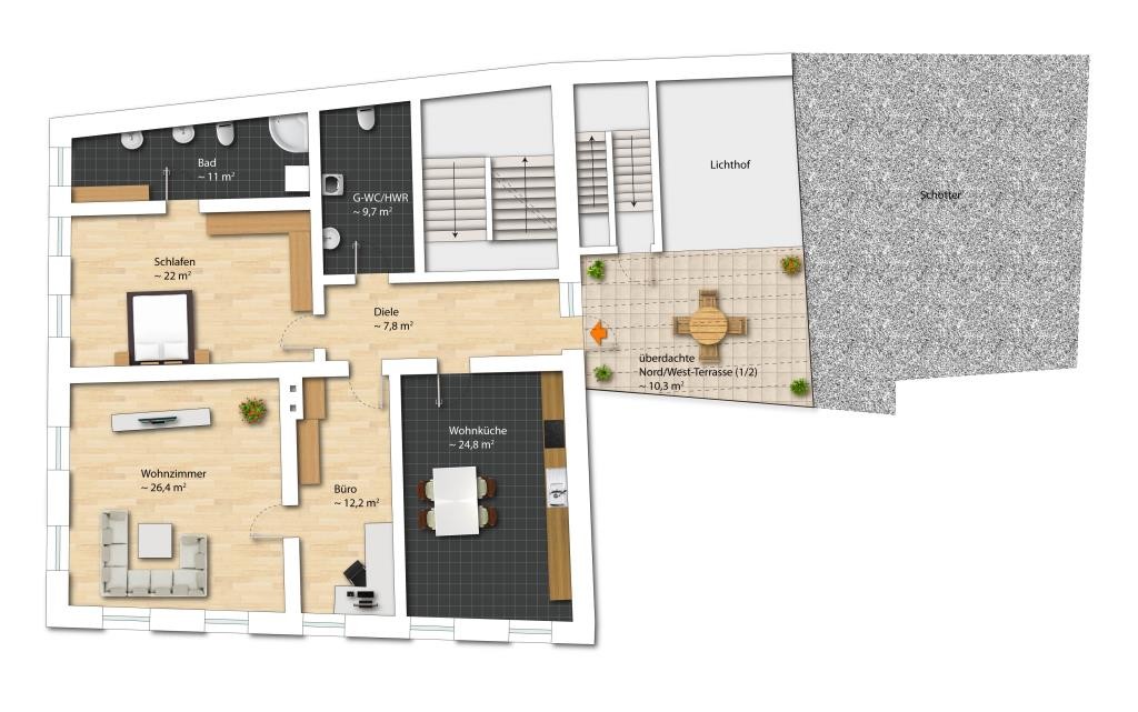 Die Wohnung im 2.OG befindet sich ebenso im Hauptgebäude. Über einen separaten Eingang im Erdgeschoss gelangt man in die ca. 124 m² große 3,5 Zimmer Wohnung, welche sich in einem teilsanierten Zustand befindet. Großzügige Räume, überhohe Decken, Echtholz-Parkett, eine Einbauküche im Retro-Chic sowie ein Bad-en Suite am Schlafzimmer bieten ein komfortables Wohnen. Die äußerst private Dachterrasse mit Nord-Westausrichtung in Richtung Innenhof ist dabei ein zusätzliches Highlight. Die Wohnung ist derzeit leerstehend und kann neuvermietet oder selbst bezogen werden.