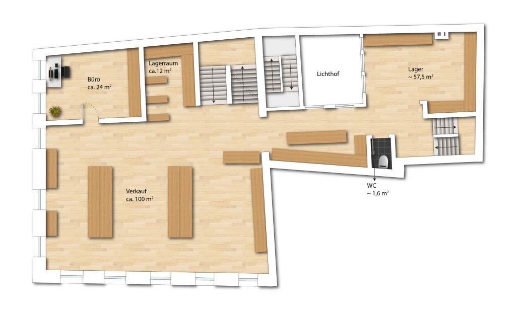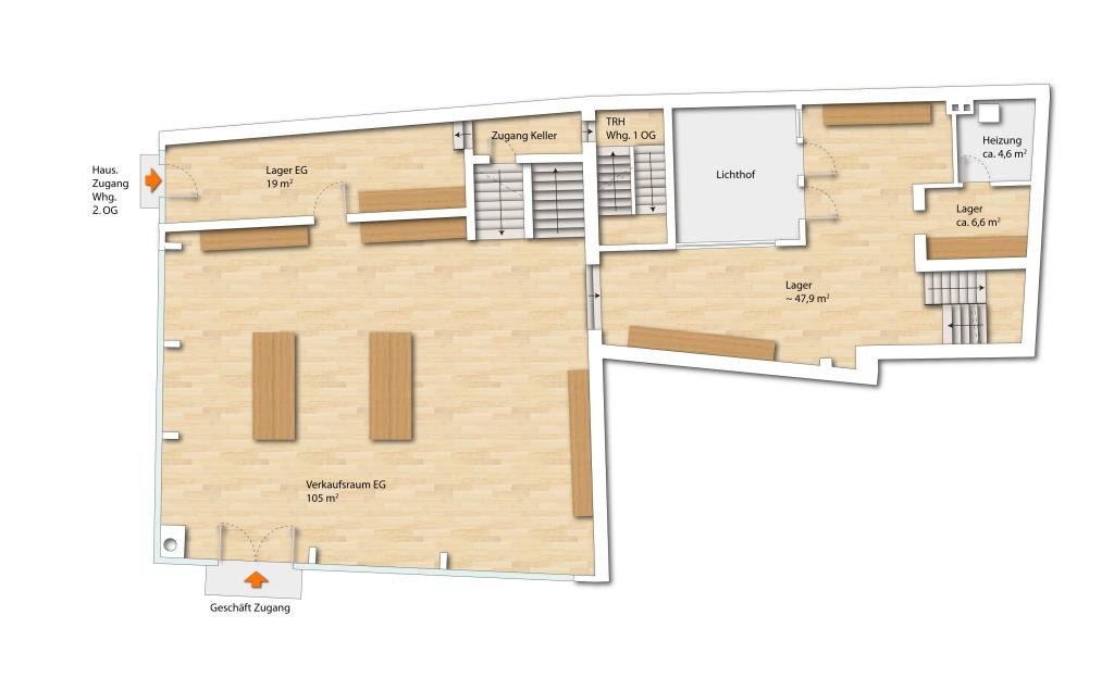Die Ladeneinheit, welche im Erdgeschoss – ideal für den Einzelhandel – über großzügige Schaufenster einen maximalen Mehrwert für Laufkundschaft bietet, wurde im Zuge des Umbaus im Jahr 1969 optimiert. So entstand im 1.OG ein weiterer Verkaufsraum mit Büro, einen ladeninterner Treppenaufgang sowie eine Feuertreppe im Zuge des Brandschutzes. Die reine Verkaufsfläche (exkl. Büro, Kunden WC, Lagerraum) beläuft sich auf beiden Etagen auf insgesamt ca. 205 m².