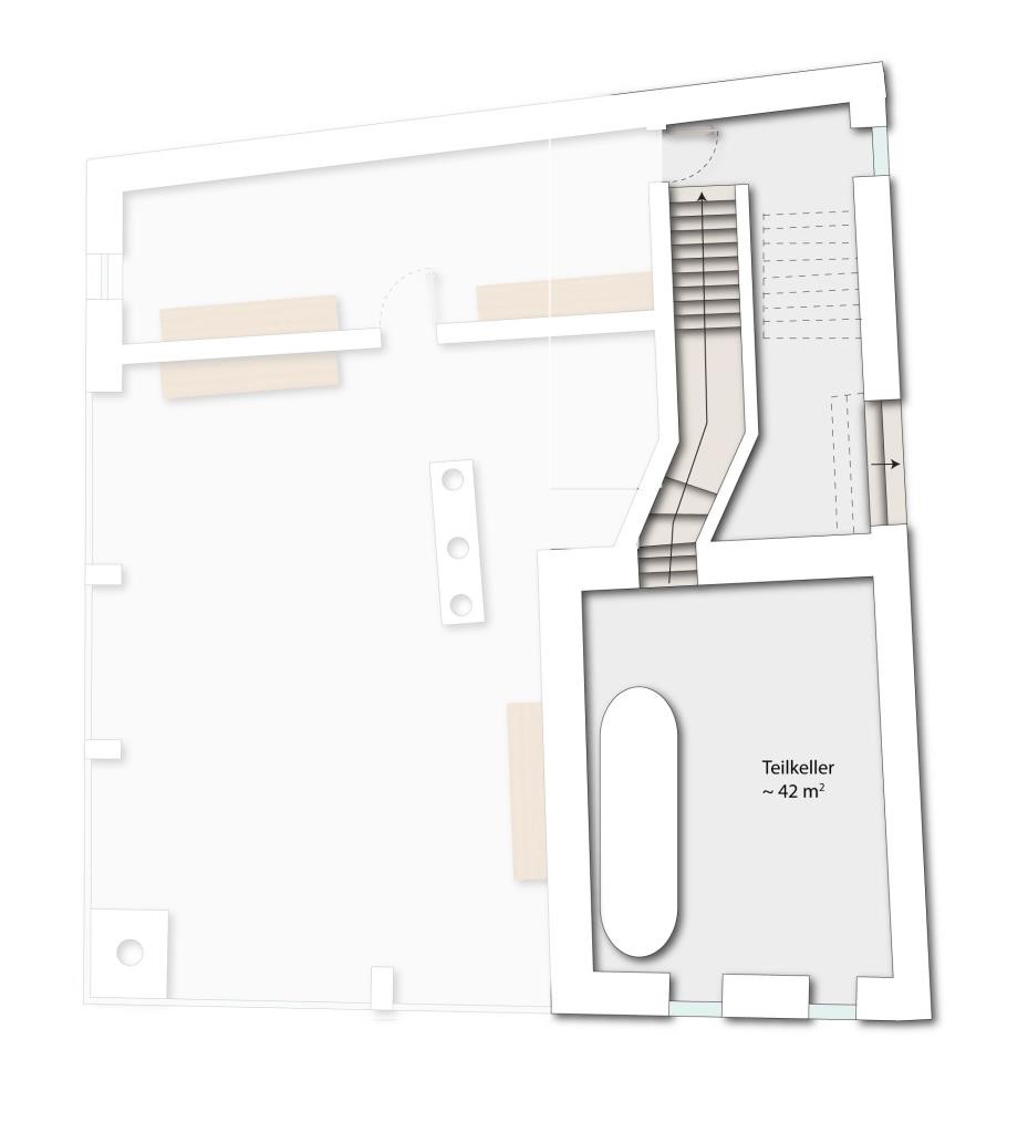 Das zugehörige Rückgebäude des Hauses wurde samt Teilunterkellerung im Jahr 1950/51 erbaut. Die hier vorhandene Fläche von ca. 173 m² grenzt direkt an die Ladeneinheit im EG und 1.OG an und bietet Platz für zwei Lager, den Heizraum sowie eine Toilette.