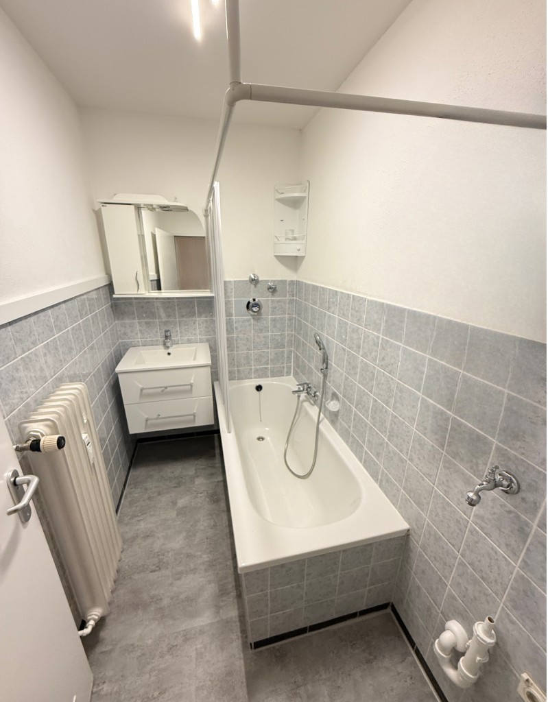 Das Badezimmer mit einer Fläche von ca. 3,66 m² verfügt über eine Badewanne mit integrierter Dusche, ein Waschbecken sowie einen Waschmaschinenanschluss.