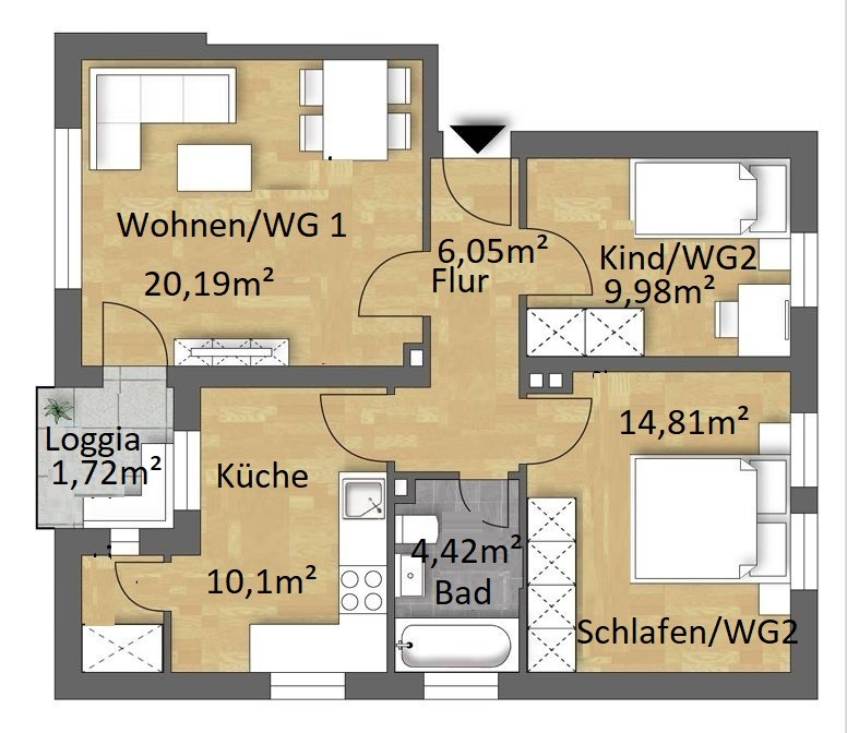 Vom zentral gelegenen Flur mit ca. 6.05 m² aus sind alle Räume der Wohnung bequem erreichbar, wodurch eine angenehme und praktische Wohnstruktur entsteht.